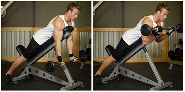 12 : Barbell Curls Incline – Bài tập cơ tay trước Cuốn tạ đòn thẳng, ghế nghiêng