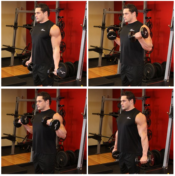 - Giữ bắp tay không chuyển động, cuốn tạ trong khi siết cơ bắp tay trước và thở ra. Chỉ có cánh tay nên chuyển động. Cổ tay xoay để lòng bàn tay hướng lên. Tiếp tục chuyển động này cho đến khi cơ bắp tay trước co lại hết cỡ và tạ ở ngang vai.