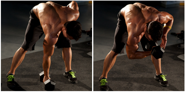 - Giữ lưng thẳng, khuỷu tay hai bên, từ từ cuốn tạ với tay yếu hơn (đối với hầu hết mọi người là bên trái) lên xa tới mức có thể.