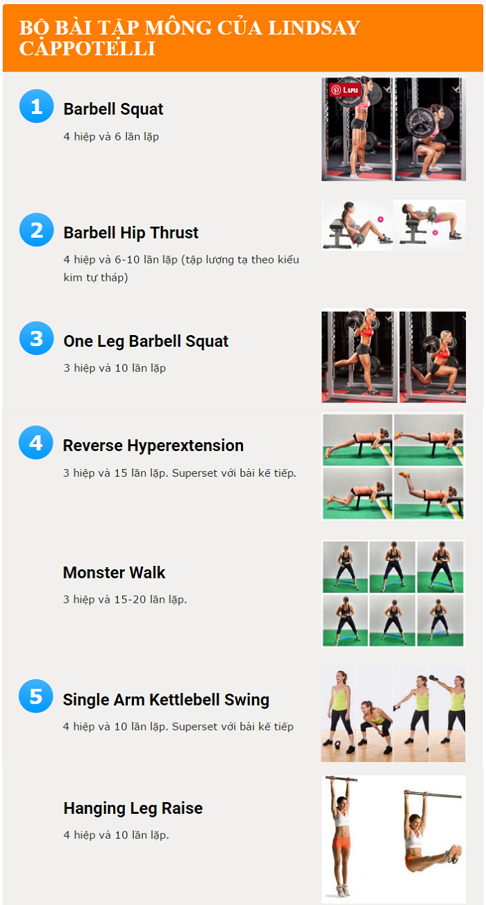 Ở cô nàng Lindsay Cappotelli thì lại luôn cố gắng đạt mục tiêu là sức mạnh và cơ bắp nên Lindsay Cappotelli hướng đến sự “to hơn” với các bài nâng tạ thuộc dạng compound trong lịch tập của mình. “Tôi là fan bự của bài tập Hip Thrust với lượng tạ nặng để xây dựng vòng 3, và tôi cũng luôn thêm 1 vài bài tập mông Isolation vào cuối buổi tập để kết thúc buổi tập mông của mình”.
