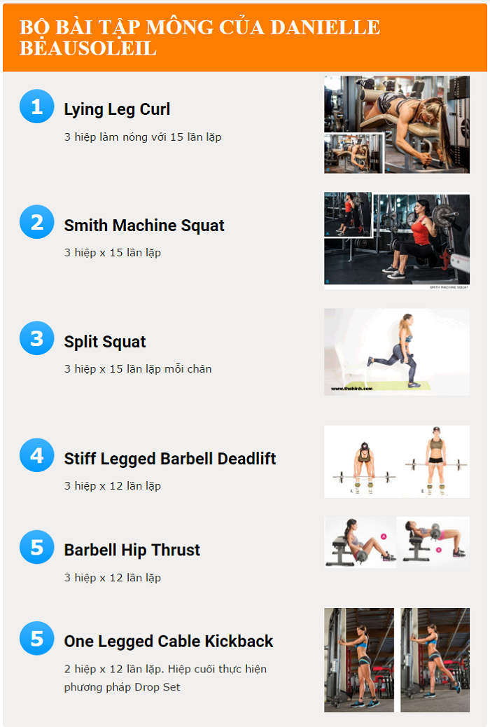 Nhắc đến cô nàng Danielle Beausoleil thì các bạn hình dung ra 1 người chuyên tập luyện mông bằng tạ nặng, Danielle Beausoleil cho biết “Bạn có thể tự xây dựng vòng 3 căng tròn theo cách riêng của mình”. Cô ấy thường thực hiện các bài làm nóng bằng Lying Leg Curl với lượng tạ nhẹ và số lần lặp cao để gia tăng lượng máu vào cơ bắp tốt hơn.