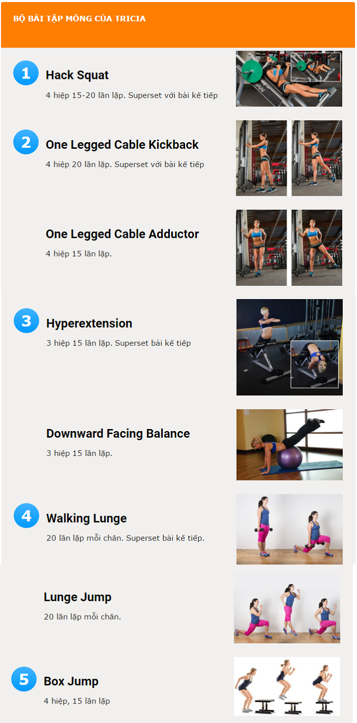 Không thua kém gì 2 nàng trên chúng ta hãy đến với chị Tricia Ashley Gutierrez lại ưu chuộng và có tư tưởng coi Mông là một trong các bộ phân được ưu ái tập luyện nhất của Tricia. Cô thường sử dụng khối lượng tạ nặng kèm với các bài tập compound bên cạnh các bài isolation với số lần lặp cao. Và nó thật sự hiệu quả với cô ấy