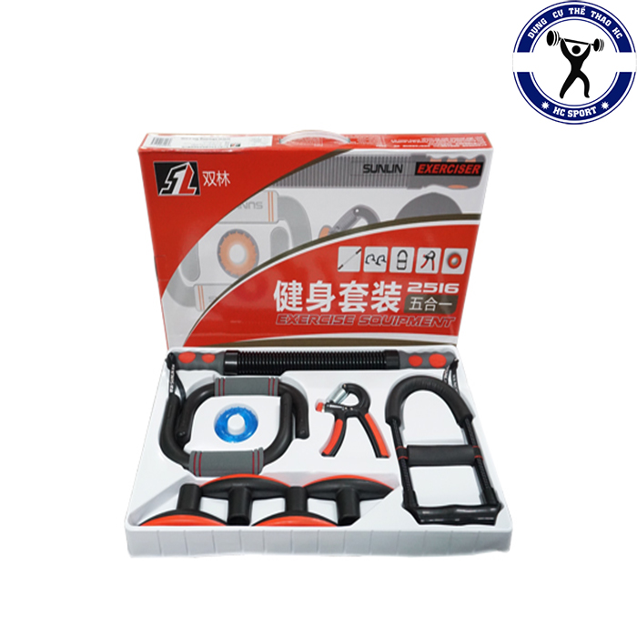 - Bộ dụng cụ tập Gym đa năng Sunlin tích hợp dụng cụ hít đất, kìm bóp tay, gậy bẻ tay, bẻ cổ tay và vòng silicone giúp tập thể hình tại nhà. Chi tiết bộ sản phẩm bao gồm: