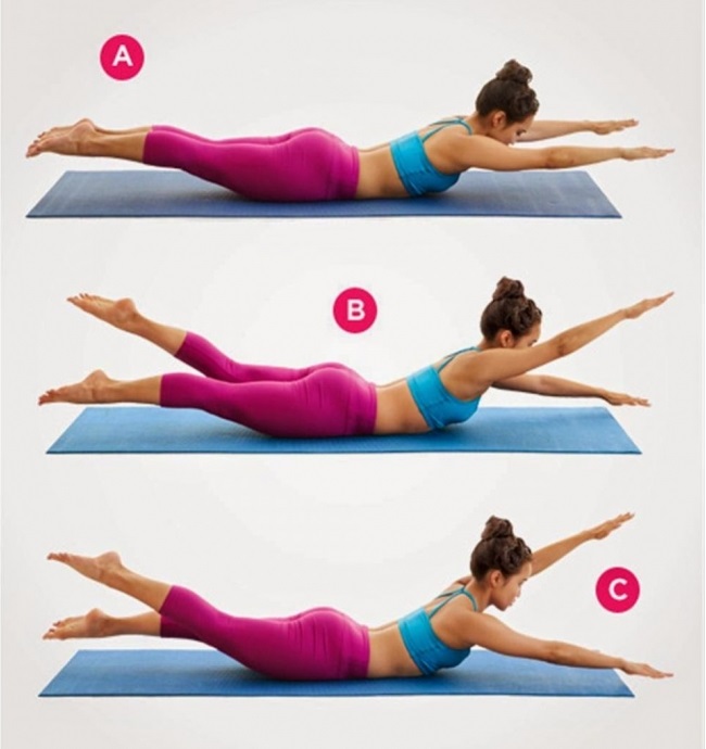 Bắt đầu bài tập này bằng cách đặt bụng xuống dưới một mặt phẳng, thân thể hoàn toàn mở rộng. Đặt cánh tay trước thẳng trước mặt với lòng bàn tay kia vuông góc với vai dưới sàn. Nâng cánh tay trái cao hơn cánh tay phải một chút. Sau ấy giữ chân thẳng và nâng chân trái của Anh Chị khỏi mặt sàn tới mức cao nhất có thể.