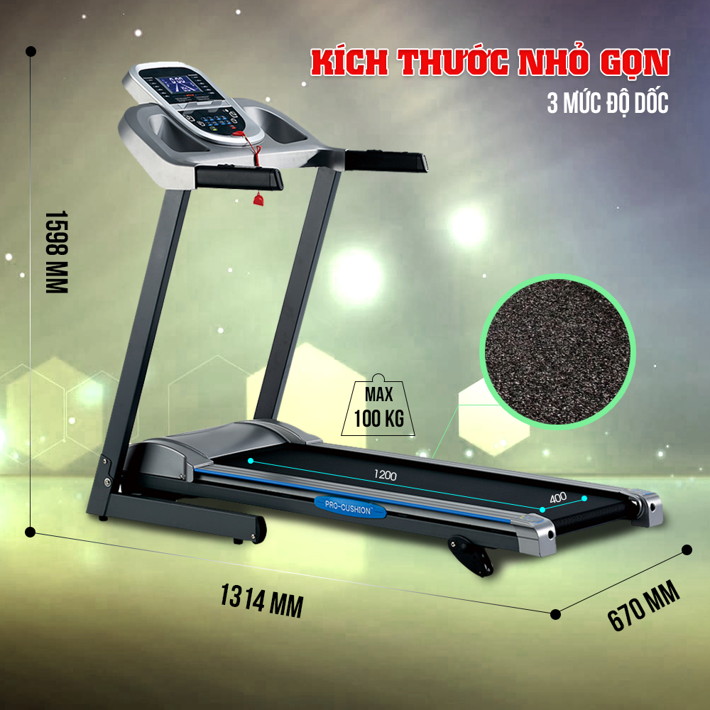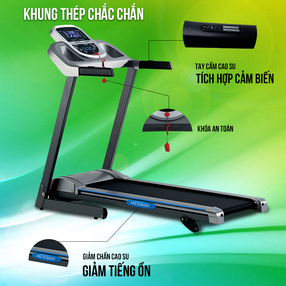 - Bề mặt bàn chạy với kích thước rộng khung thép chắc khỏe chịu tải trọng lớn giúp người tập thoải mái thực hiện các động tác chạy, đi bộ hoặc tập luyện với cường độ cao mà không có cảm giác khó chịu hay gò bó bước chân.