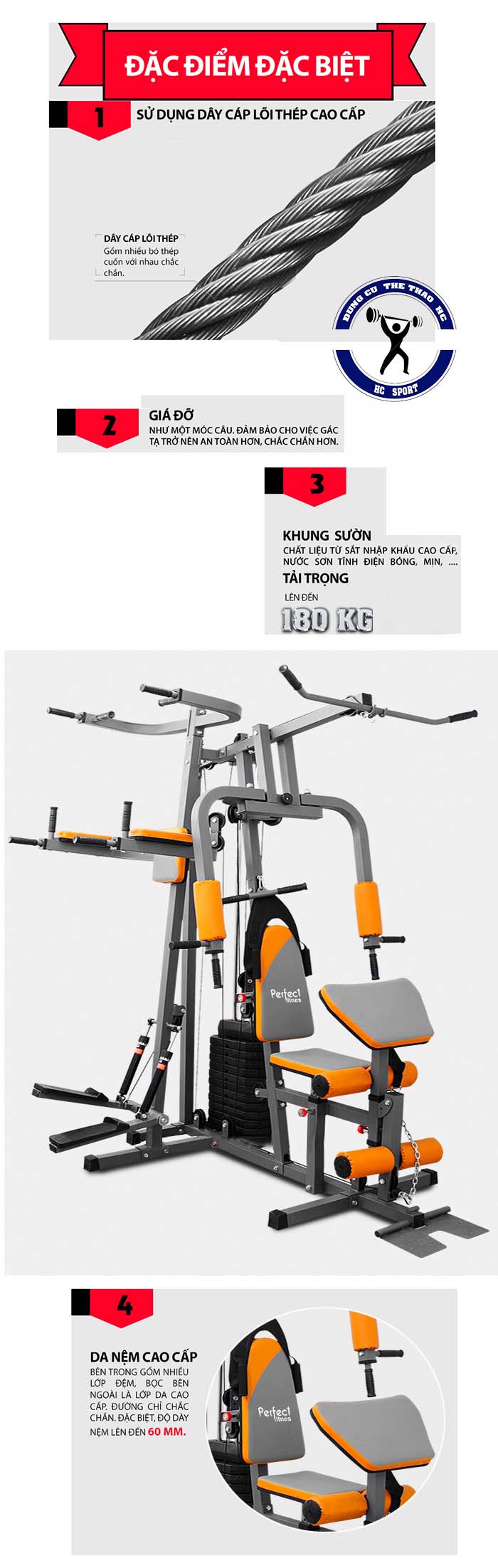 - Giàn tạ đa năng Perfect Fitness ES 4131 cấu tạo từ nhiều phần khác nhau và được gắn kết chắc chắn lại, với đầy đủ các bài tập cần thiết cho luyện tập Gym tại nhà.
