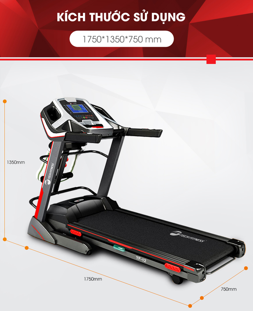 - Máy chạy bộ Tech Fitness TF-12 hỗ trợ tập luyện thể thao tốt nhất cho sức khỏe mọi người. Bạn muốn có hình thể săn chắc, đường cong nóng bỏng, hay nâng cao sức đề kháng, cải thiện sức khỏe thì TF-12 là một lựa chọn rất tốt cho mọi người. Là máy chạy bộ điện thế hệ mới với sự cải tiến về thiết kế, máy đáp ứng được mọi nhu cầu tập đi bộ, chạy bộ từ tốc độ thấp đến cao. Dù nhu cầu của bạn là thư giãn, rèn luyện thể nâng hay nâng cao thể chất với bài tập chuyên sâu, cường độ cao của vận động viên chuyên nghiệp, TF-12 đều có thể đáp ứng một cách tốt nhất.