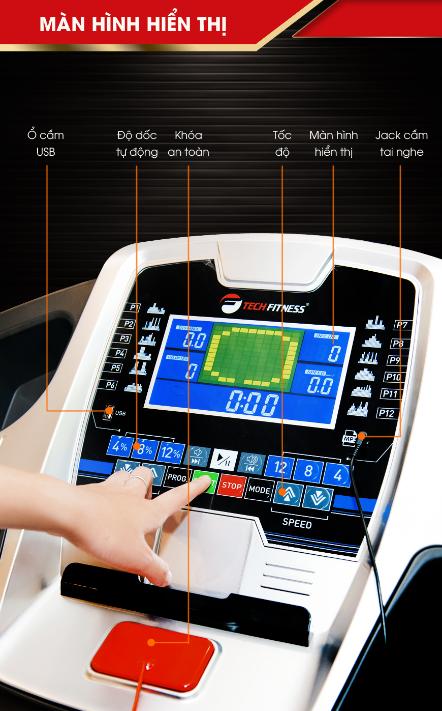 - Với máy chạy bộ đa năng Tech Fitness TF-12 màn hình LCD 7 inch hiển thị thông minh tích hợp đầy đủ các chức năng như quãng đường, thời gian, tốc độ và nhịp tim giúp bạn kiểm soát quá trình tập luyện được hiệu quả hơn. Chúng ta có thể dựa vào đó để điều chỉnh quá trình tập luyện phù hợp với năng lực bản thân mình. Ngoài ra ở trên còn các các cổng cắm USB, jack cắm tai nghe giúp bạn nghe nhạc, thư giãn trong các bài tập. Phần nào giảm đi các mệt mỏi khi bạn thực hiện chạy bộ.