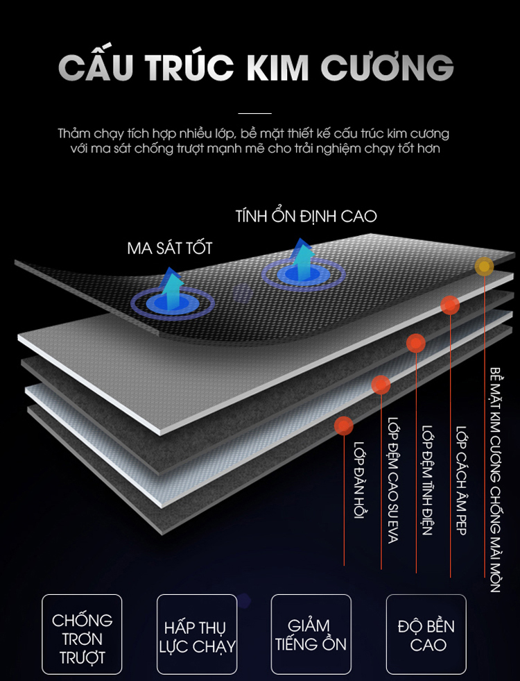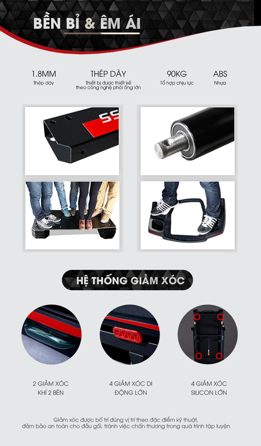 - Thảm chạy kích thước rộng lớn, chạy bộ cảm giác thoải mái hơn nhiều. Chất liệu thảm chạy cao cấp, đảm bảo không trơn trượt, không hao mòn theo thời gian. Động cơ DC 3.5 HP đạt tiêu chuẩn USA siêu bền, chạy lâu, chạy nhanh không hề lo hâm nóng động cơ.