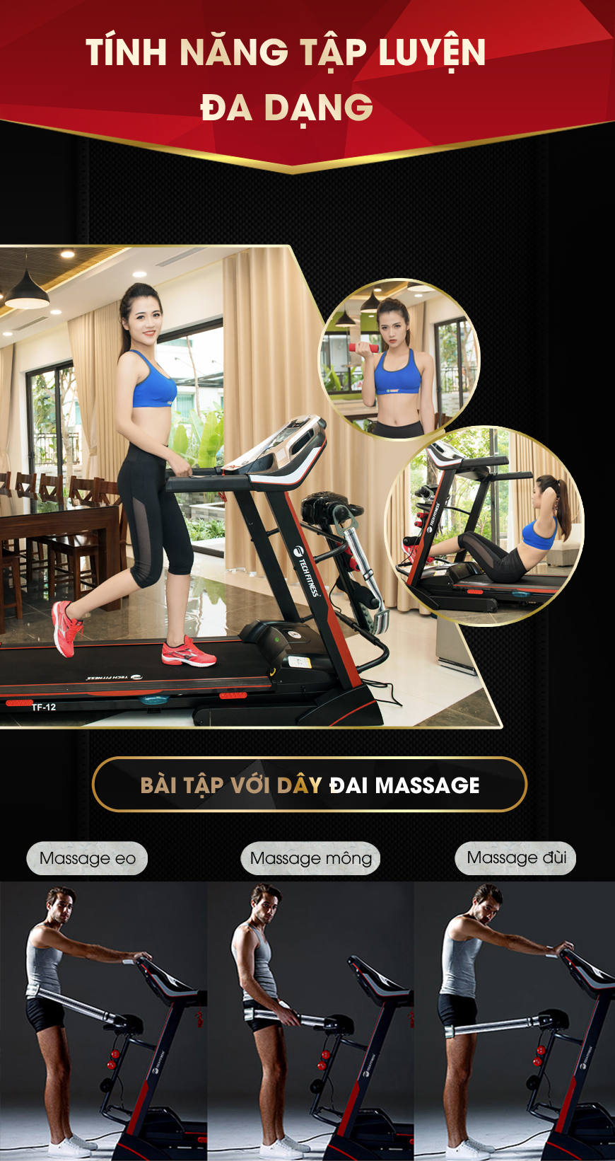 - Sử dụng máy chạy bộ đa năng TF-12 bạn không những có thể thực hiện các bài tập chạy bộ và đi bộ mà còn có thể thực hiện các bài tập khác như là massage bụng, đùi,chân và tay được hiệu quả hơn.