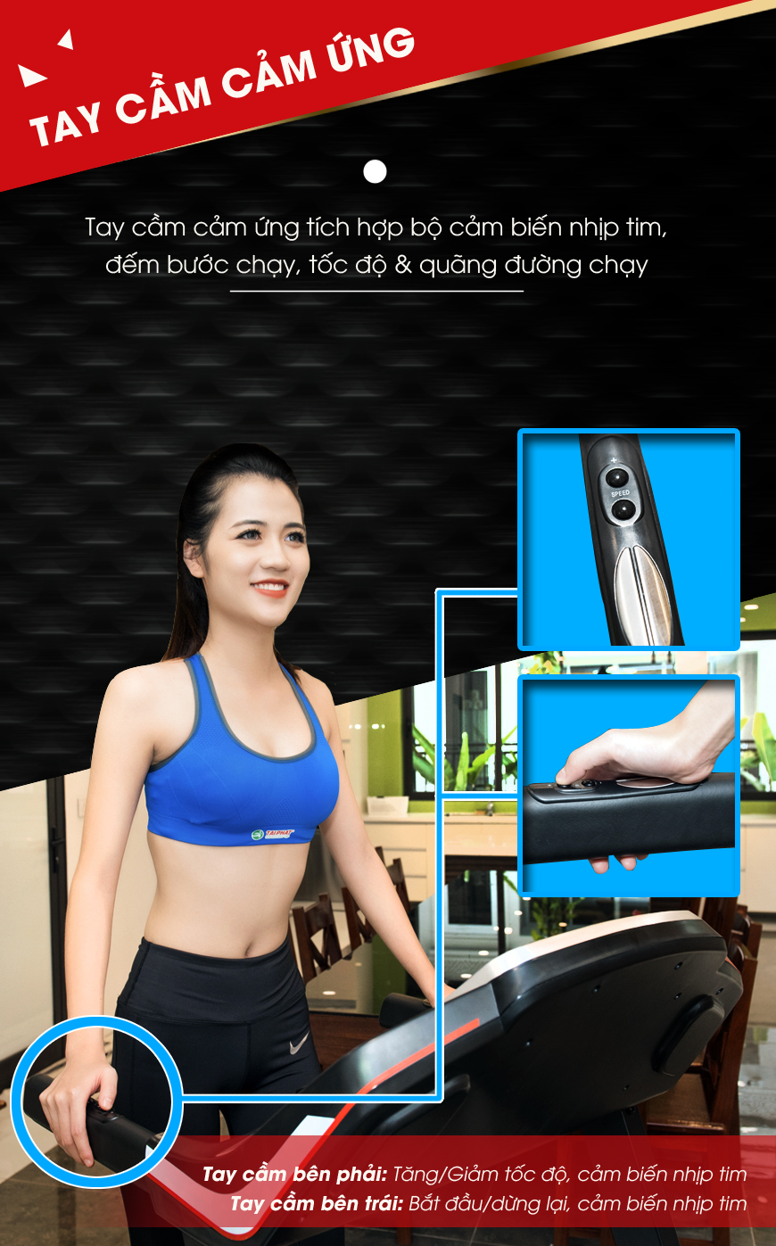 - Giống như những một số máy tập chạy bộ khác của hãng Tech Fitness, tay cầm máy chạy bộ đa năng TF-12 gồm 5 chức năng như thay đổi tốc độ các bài tập, thay đổi độ dốc băng tải, cảm biến nhịp tim dễ dàng hơn trong lúc tập luyện. Ngoài ra còn có thêm 2 chức năng khác tắt và khởi động máy. Thật dễ dàng và thuận tiện hơn rất nhiều nếu như bạn sử dụng máy tập này, nếu không chúng ta cũng hoàn toàn có thể sử dụng các tính năng trên màn hình hiển thị, thay đổi các thông số bài tập tại màn hình.