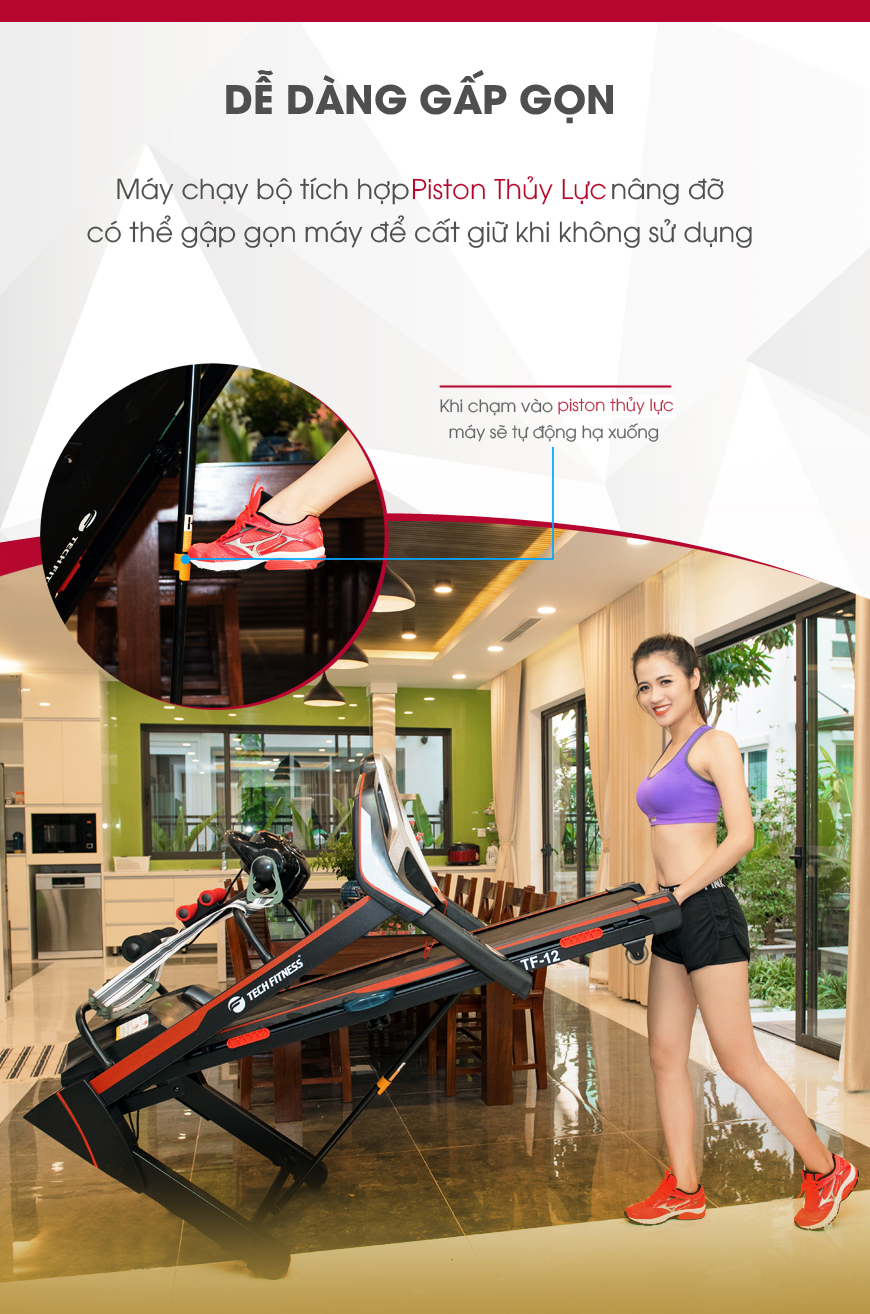 - Lựa chọn máy tập chạy bộ TF-12 để hỗ trợ tập chạy thể dục tại nhà thì không hề lo lắng máy chiếm nhiều diện tích căn phòng mình. Khi không sử dụng, bạn có thể gấp gọn máy, thu nhỏ kích thước tối đa. Động tác thu gọn máy cũng khá đơn giản, bạn có thể thực hiện một mình bởi máy được tích hợp piston thủy lực trợ giúp nâng - hạ máy, mang đến sự tiện nghi tối ưu cho người sử dụng.