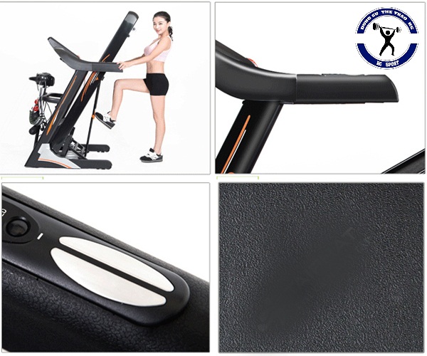 - Hệ thống băng chạy được thiết kế gồm 5 lớp cực dày, bề mặt phủ lớp tăng ma sát, chống chơn trượt khi tập.