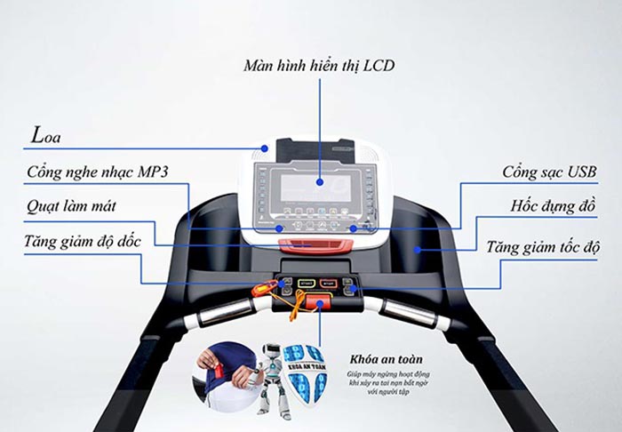 + Bảng điều khiển được thiết kế trực quan, có nhiều phím bấm lựa chọn nhanh chương trình và dễ dàng điều chỉnh khi tập luyện. Trên bảng điều khiển tích hợp màn hình LCD 7 inch; khóa an toàn; phím Start/Stop; phím tăng chỉnh tốc độ, độ dốc; các phím lựa chọn chương trình tập luyện; loa nghe nhạc; cổng mp3 nghe nhạc; cổng USB sạc điện thoại; hộc đựng đồ và quạt làm mát.