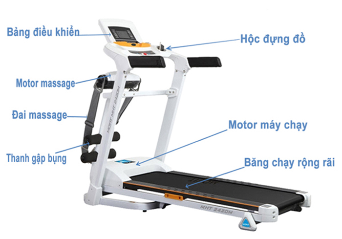 - Máy chạy bộ điện cao cấp MHT 2420M còn được trang bị 1 đầu massage, đánh mỡ bụng, bộ phận gập bụng, xoay eo rời giúp đa dạng bài tập trên cùng một máy tập thể dục tại nhà