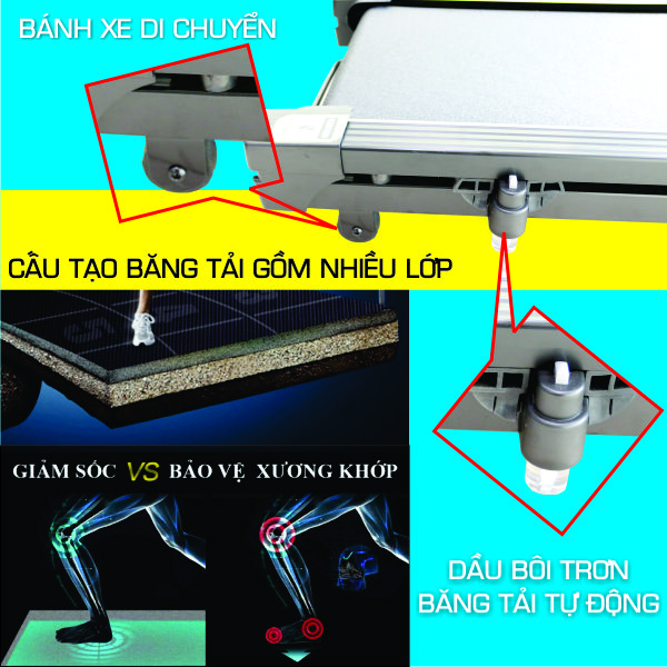 - Băng tải có lớp sần làm tăng độ ma sát, chống trơn trượt, đồng thời người tập thoải mái sải chân với kích thước bàn chạy rộng lên tới 1200x450(mm).