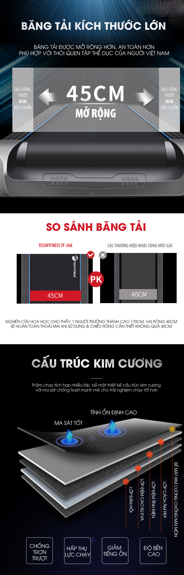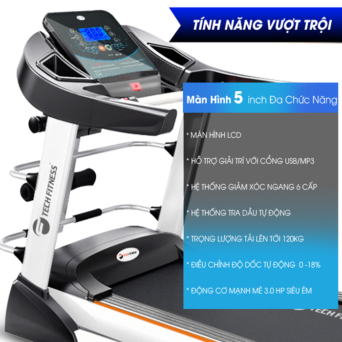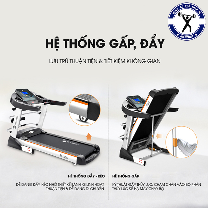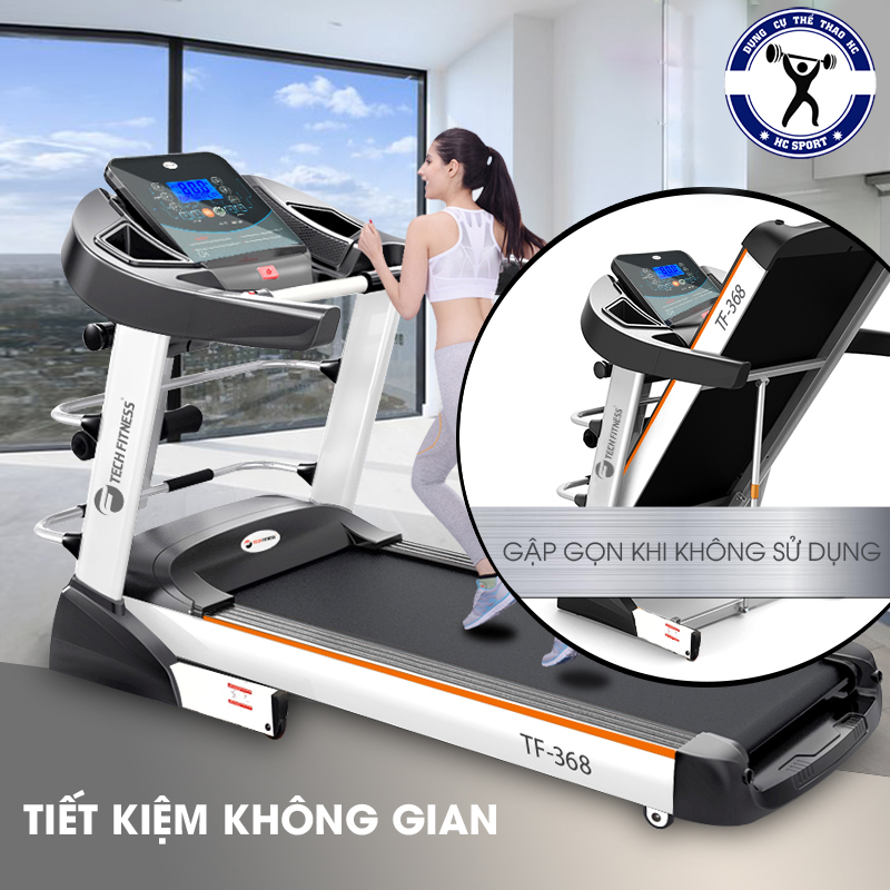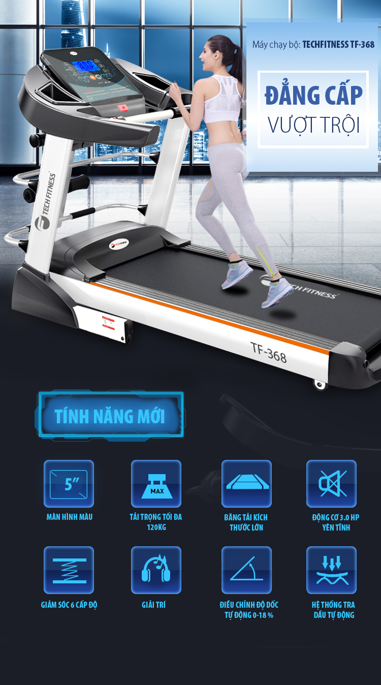 - Tech Fitness TF-368 là model máy chạy bộ điện đa năng của Tech Fitness với công suất động cơ 3.0HP đảm bảo khả năng chịu tải cho cường độ tập luyện thể dục chạy bộ tại nhà. Trên dòng máy tập chạy bộ này với các tính năng: