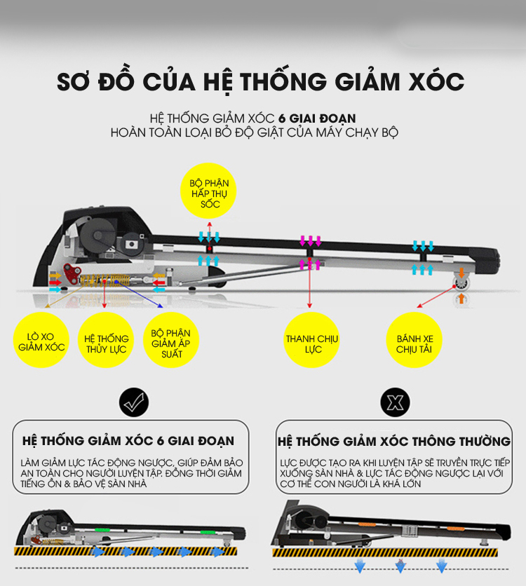 - Piston thủy lực hỗ trợ cho chức năng gấp gọn máy chạy bộ dễ dàng, nhằm giúp gia đình tiết kiệm không gian đặt máy. Và quan trọng hơn là tính năng này có tác dụng rất lớn trong việc bảo vệ thảm chạy chạy khi không sử dụng. Khi không sử dụng, băng chạy được gấp lên tránh những sự va đập hay sự cố đổ nước lên mặt băng chạy bộ.