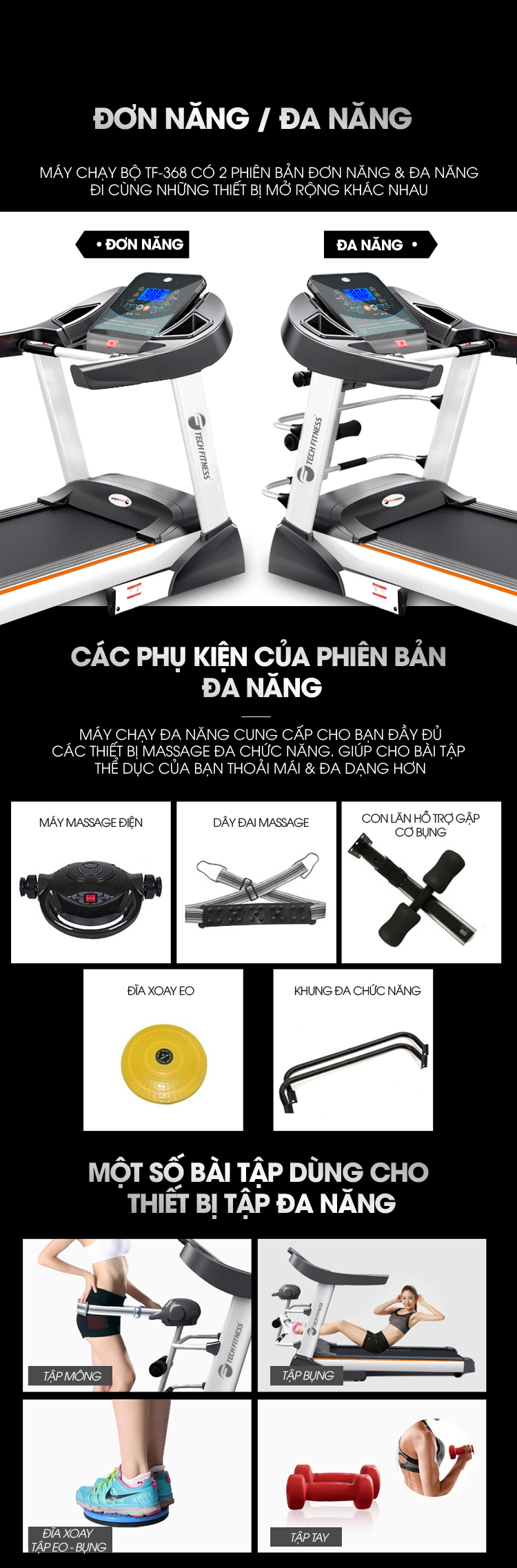 - Máy chạy bộ điện Tech Fitness TF-368 có hai phiên bản đa năng và đơn năng.